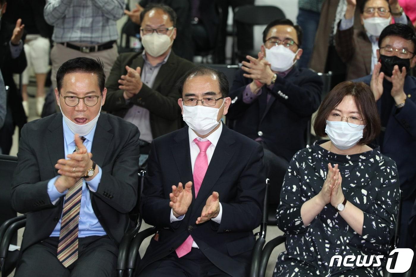 태구민(태영호) 당시 미래통합당 강남갑 후보가 16일 새벽 서울 강남구 신사동 자신의 선거사무소에서 21대 국회의원선거 당선이 확실해지자 박수치고 있다. 2020.4.16/뉴스1 ⓒ News1 신웅수 기자
