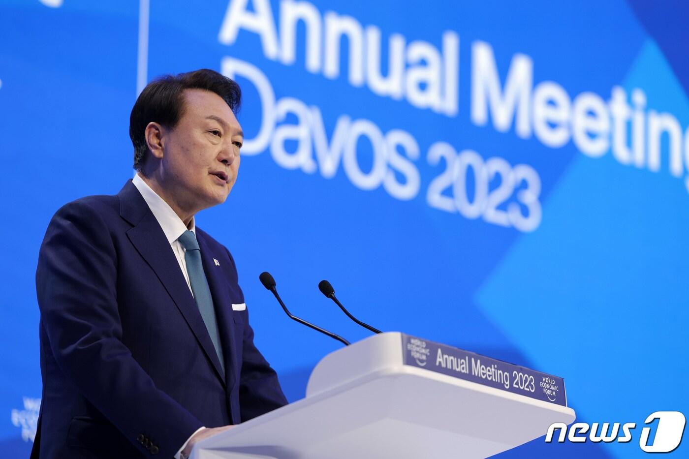 윤석열 대통령이 19일 오전(현지시간) 스위스 다보스에서 열린 2023년 세계경제포럼(World Economic Forum, 다보스포럼) 연차총회에서 '행동하는 연대를 위하여'라는 주제로 특별연설을 하고 있다. (대통령실 제공) 2023.1.21/뉴스1 ⓒ News1 안은나 기자