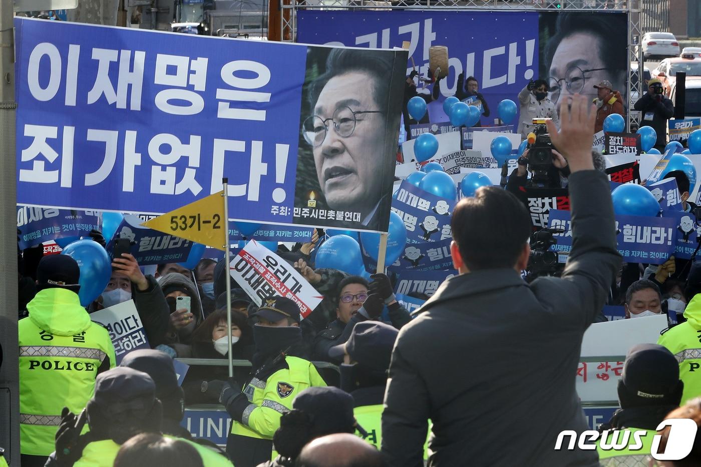 이재명 더불어민주당 대표가 대장동 개발 특혜 의혹 사건 관련 검찰 조사를 받기 위해 28일 오전 서울 서초구 서울중앙지방검찰청에 출석에 앞서 지지자들을 향해 손인사하고 있다. 2023.1.28/뉴스1 ⓒ News1 이동해 기자