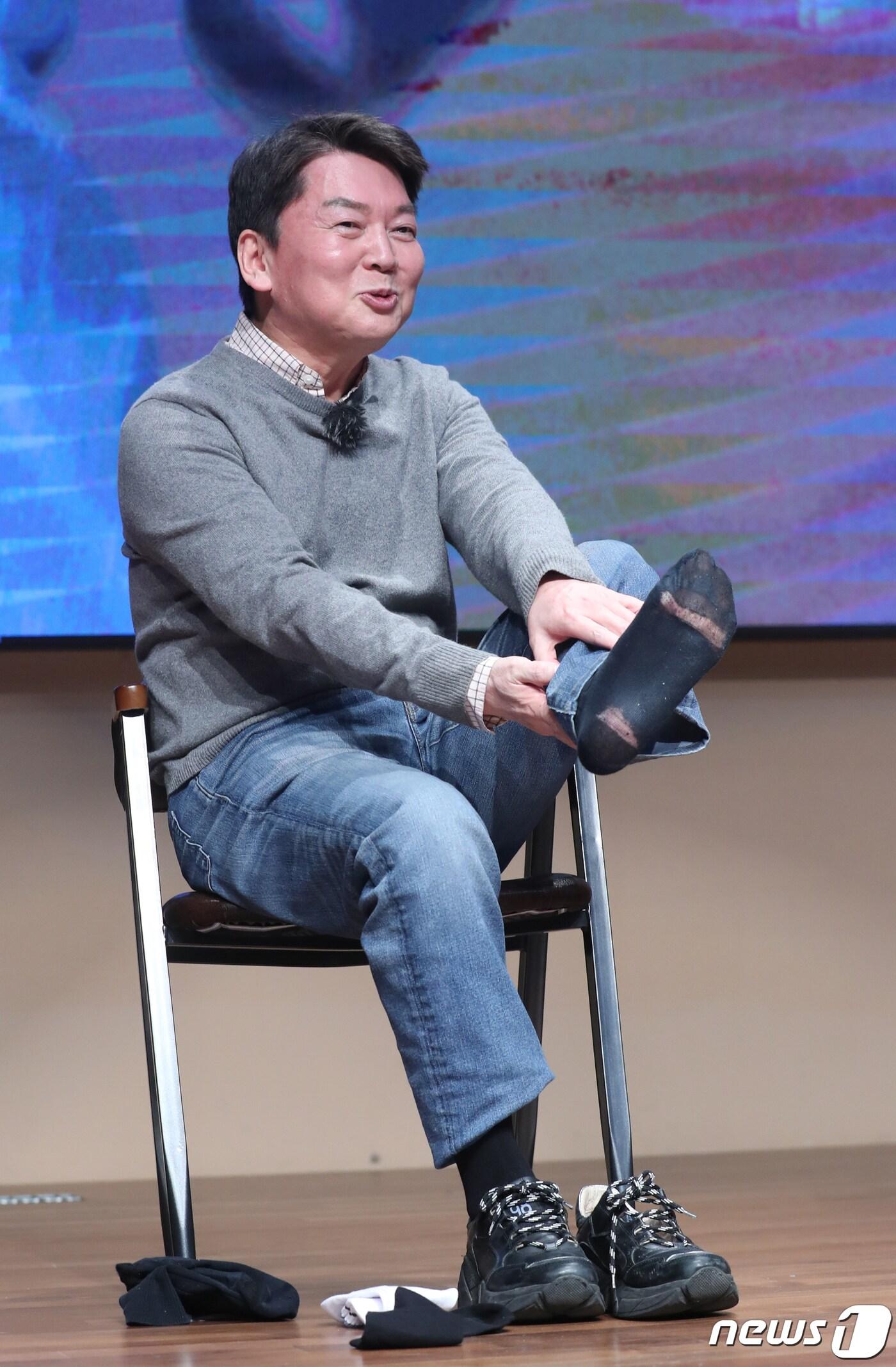 국민의힘 당권주자인 안철수 의원이 29일 오후 경기 양주 경기섬유종합지원센터에서 열린 '수도권 청년들의 미래를 위한 토크콘서트'에서 청년 당원이 선물한 양말로 갈아 신기 위해 신고 있던 해진 양말을 들어보이고 있다. ⓒ News1 송원영 기자