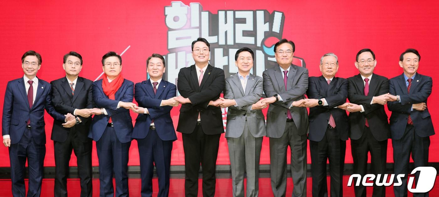 정진석 국민의힘 비상대책위원장을 비롯한 지도부와 당대표 후보들이 7일 서울 강서구 한 방송 스튜디오에서 열린 국민의힘 제3차 전당대회 후보자 비전발표회에 앞서 기념 촬영을 하고 있다. 왼쪽부터 조경태, 윤상현, 황교안, 안철수, 천하람, 김기현 후보, 정 비대위원장, 유흥수 국민의힘 선거관리위원장, 주호영 원내대표, 김석기 사무총장. 2023.2.7/뉴스1 ⓒ News1 국회사진취재단