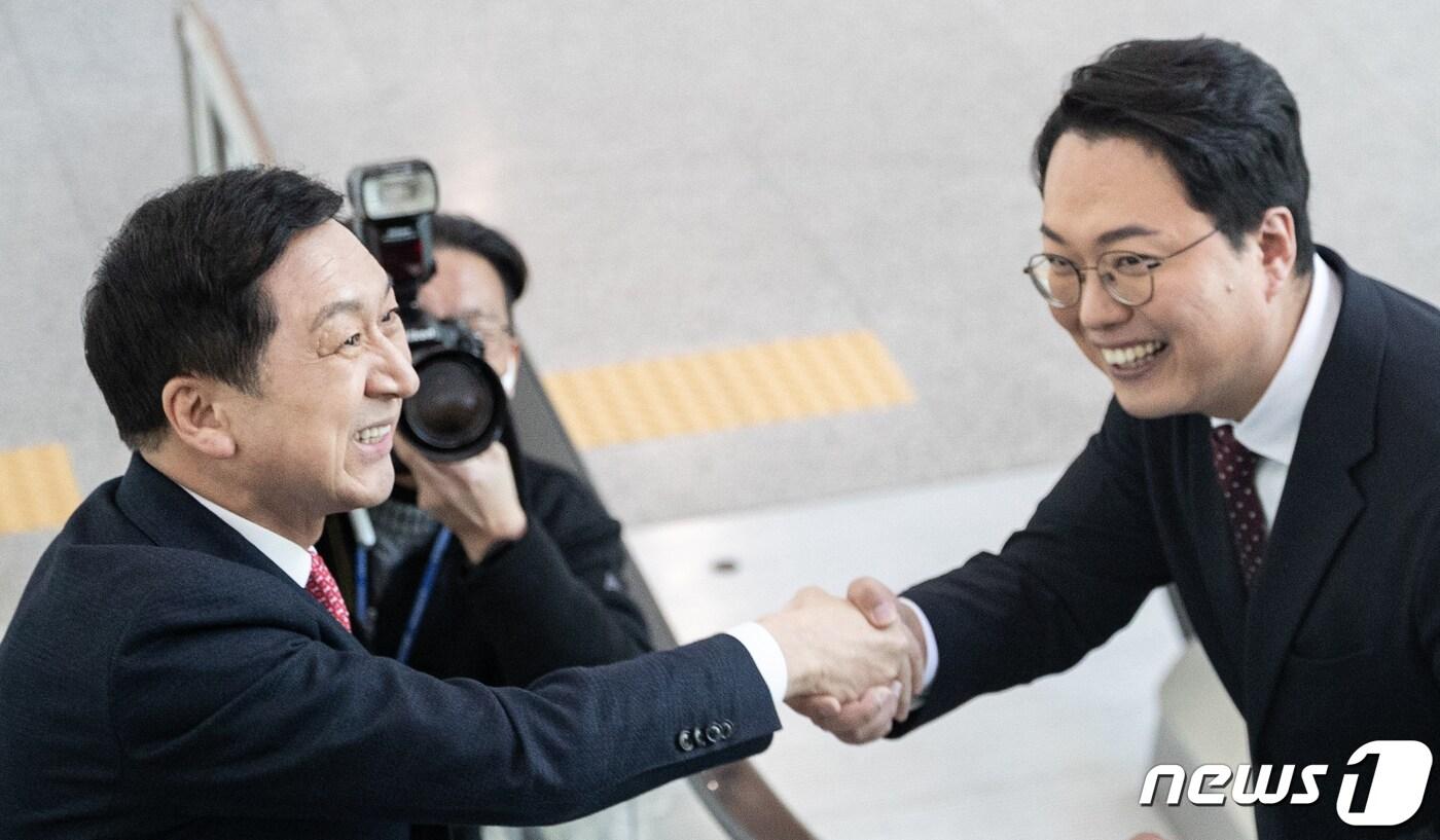 지난 2월 26일 김기현(왼쪽), 천하람 국민의힘 당대표 후보가 서울 여의도 국회 소통관에서 만나 악수하고 있다. ⓒ News1 이재명 기자
