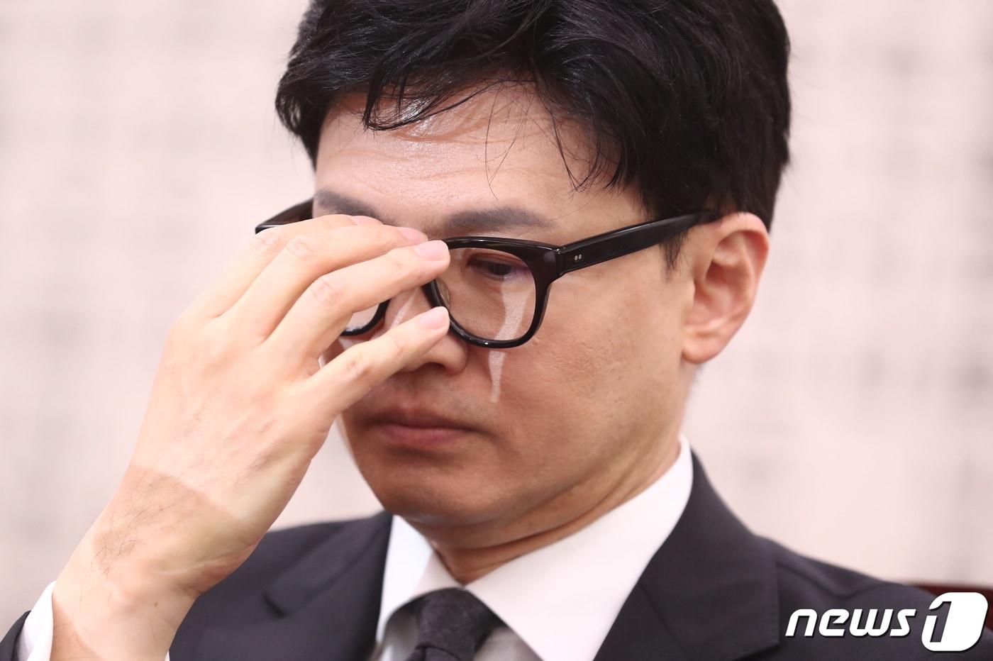한동훈 법무부 장관이 27일 서울 여의도 국회에서 열린 제404회 국회(임시회) 법제사법위원회 제2차 전체회의에 출석해 안경을 고쳐 쓰고 있다. 2023.3.27/뉴스1 ⓒ News1 유승관 기자