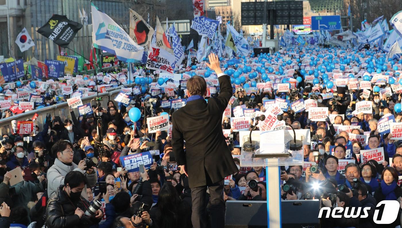 日 오염수 시찰단 방일 하루 앞두고 대규모 집회 참석李 리더십 타격 속 당 내 잡음…핵심지지층 이탈 우려이재명 더불어민주당 대표가 지난 2월4일 서울 중구 숭례문 앞에서 열린 '윤석열 정권 민생파탄 검사독재 규탄대회'에서 연설을 하고 있다. (공동취재)/뉴스1 ⓒ News1 ,송원영 기자관련 키워드코인돈 봉투이재명김남국장외집회정재민 기자 대법, 장예찬 '여론조사 왜곡 공표' 유죄 취지 파기환송천대엽 "사법부 불신 깊이 사과…사법부, 개혁 대상 아닌 동반자로 참여"관련 기사주진우 "이재명 부업정부, 국민은 옥죄고 자기들 배만 불려"