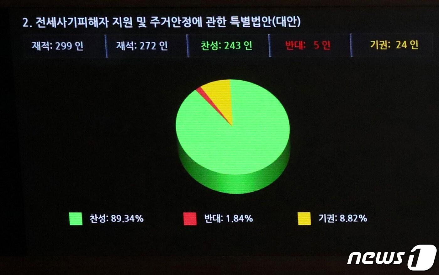 25일 서울 여의도 국회에서 열린 제406회국회(임시회) 제1차 본회의에서 전세사기 피해자들에게 금융 지원을 확대하고 정부가 정부가 경·공매 대행 서비스를 제공하는 내용의 '전세 사기 피해자 지원 및 주거 안정에 관한 특별법' 이 통과되고 있다. 2023.5.25/뉴스1 ⓒ News1 송원영 기자