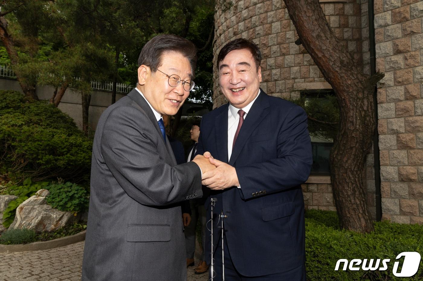 이재명 더불어민주당 대표가 8일 오후 서울 성북구 중국대사관저를 방문해 싱하이밍 주한중국대사와 인사를 나누고 있다. 2023.6.8/뉴스1 ⓒ News1 국회사진취재단