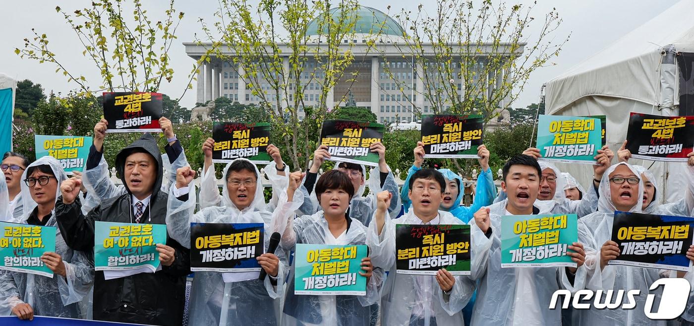 한국교원단체총연합회, 교사노동조합 연맹, 전국교직원노동조합 등 169개 교원단체·교원노조 관계자들이 13일 서울 영등포구 국회 앞에서 열린 '공교육 정상화를 위한 국회 입법 촉구' 기자회견에서 구호를 외치고 있다. 2023.9.13/뉴스1 ⓒ News1 김도우 기자