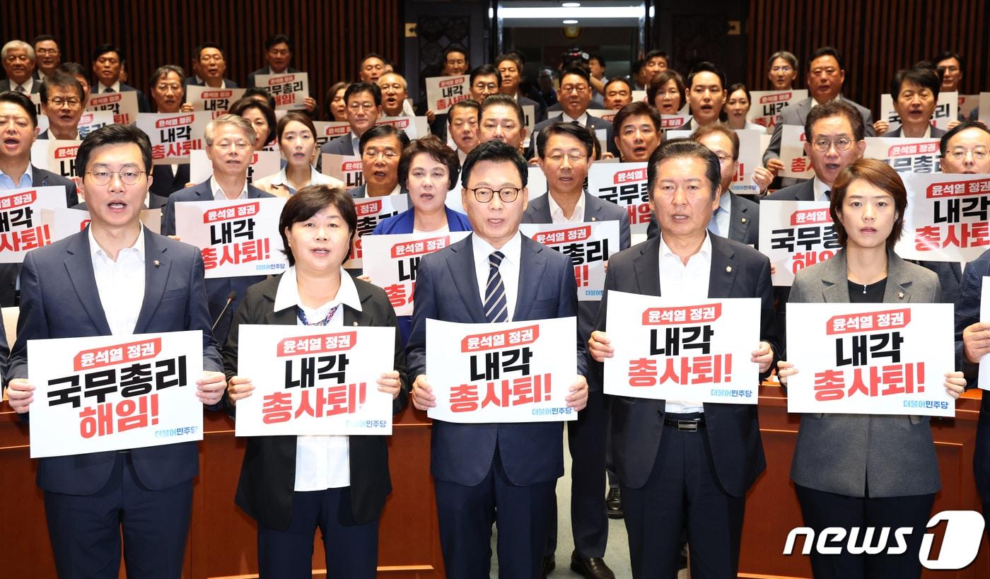 박광온 더불어민주당 원내대표를 비롯한 의원들이 18일 서울 여의도 국회에서 열린 의원총회에서 '국무총리 해임, 내각 총사퇴' 손피켓을 들고 구호를 외치고 있다. 2023.9.18/뉴스1 ⓒ News1 송원영 기자
