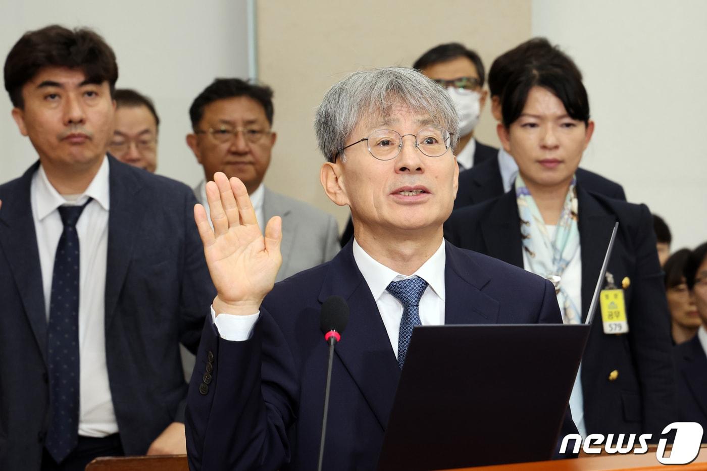 김광동 진실화해위원회 위원장이 13일 서울 여의도 국회에서 열린 행정안전위원회의 진실화해위원회 등 국정감사에서 선서를 하고 있다. 2023.10.13/뉴스1 ⓒ News1 황기선 기자