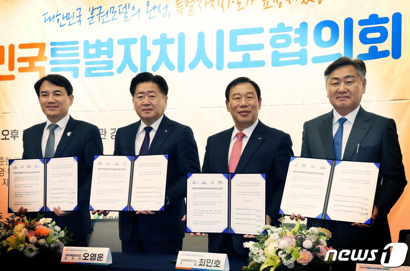 오영훈 대한민국특별자치시도협의회 회장 등이 27일 서울 여의도 국회 도서관에서 열린 대한민국특별자치시도협의회 출범식에서 공동 결의문을 들고 기념촬영을 하고 있다. 왼쪽부터 김진태 강원특별자치도지사, 오영훈 회장, 최민호 세종특별자치시장, 김관영 전라북도 도지사. 2023.11.27/뉴스1 ⓒ News1 송원영 기자