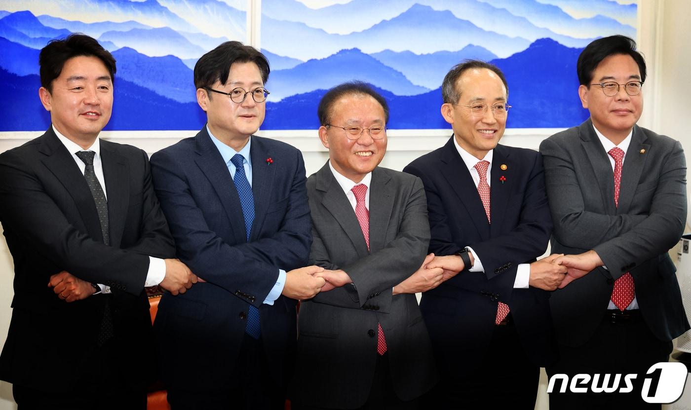 윤재옥 국민의힘 당대표 권한대행과 홍익표 더불어민주당 원내대표 등이 20일 오후 국회 운영위원장실에서 회동을 갖고 2024년도 예산에 대한 합의사항을 발표에 앞서 손을 잡고 있다. 왼쪽부터 강훈식 더불어민주당 예결위간사, 홍익표 원내대표, 윤재옥 당대표 권한대행, 추경호 경제부총리, 송언석 국민의힘 예결위 간사. (공동취재) 2023.12.20/뉴스1 ⓒ News1 송원영 기자관련 키워드예산안국회더불어민주당국민의힘이비슬 기자 재수감 성범죄자 신상정보 공개기간 연장…법 개정 추진서울시, 2026 서울국제정원박람회 '작가정원' 5개 확정관련 기사[오늘의 국회일정] (16일, 금)[프로필]한병도 국회운영위원장…정무수석 출신 합리적 중진[프로필] 與 새 원내대표에 한병도…'당 안팎 두루 원만한 호남 3선'문진석 "李정부 첫 원내지도부 마무리…남은 과제 다음 지도부로"美하원도 "韓, 美기술기업 차별" 우려…USTR에 대책 마련 요구