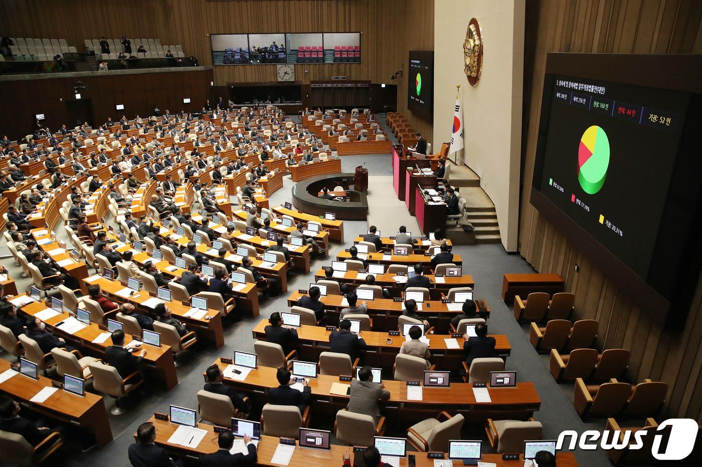 상속세 및 증여세법 개정안 통과…중소기업주 최저세율 기준 120억으로조세특례제한법…월세 소득공제 기준 8000만원·자녀장려금 100만원 확대21일 오후 서울 여의도 국회에서 열린 제411회국회(임시회) 제2차 본회의에서 상속세 및 증여세법 일부개정법률안(대안)이 재적 298인, 재석 256인, 찬성 160인, 반대 44인, 기권 52인으로 가결되고 있다. 2023.12.21/뉴스1 ⓒ News1 임세영 기자관련 키워드상속세 및 증여세법 일부개정법률안조세특례제한법국민의힘국힘더불어민주당민주박기범 기자 우주경제 1조 달러 눈앞인데…韓 우주항공 수출 '걸음마' 수준대한항공·아시아나항공, 임직원 가족과 '자녀 안전체험' 행사 진행