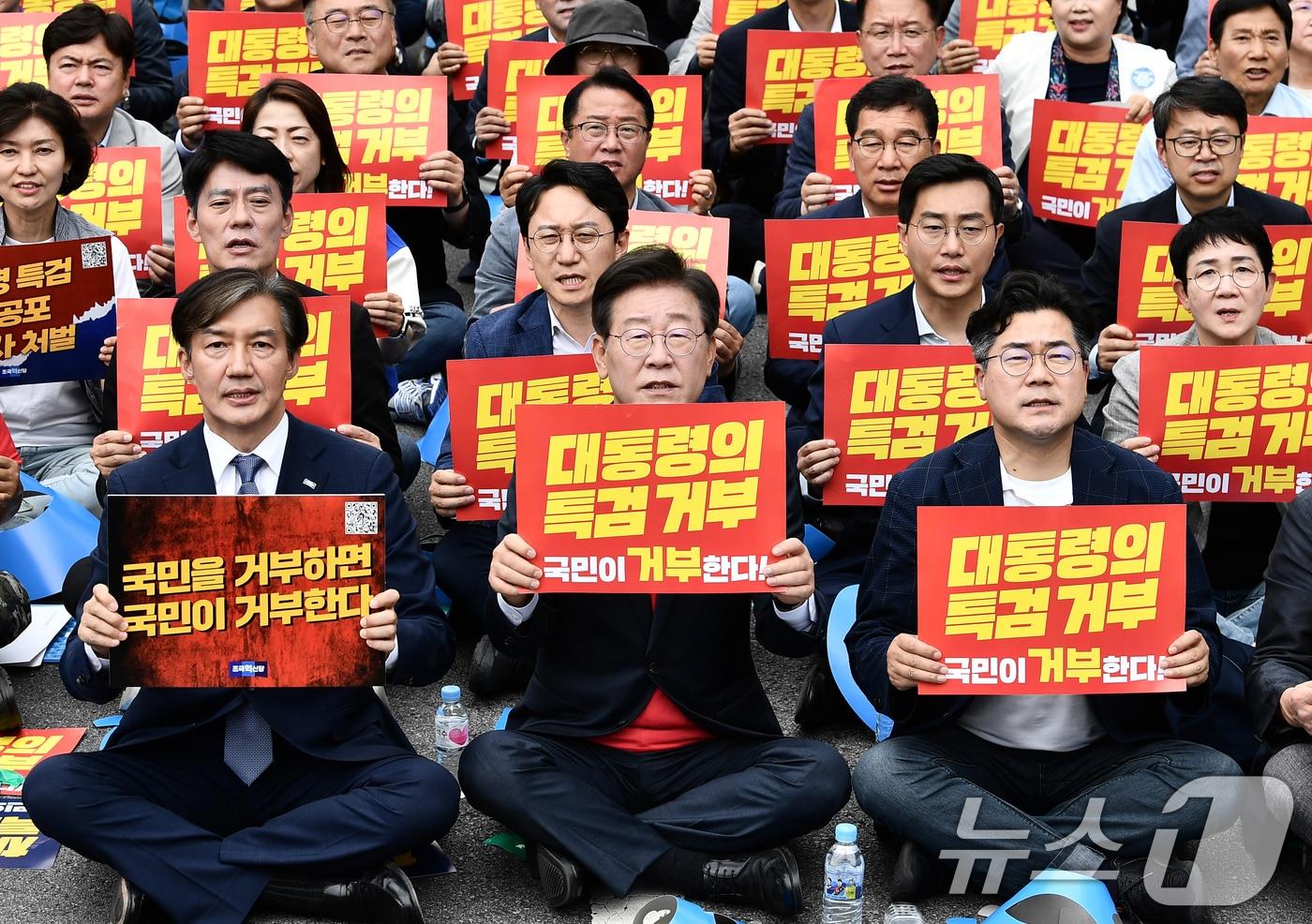 이재명 더불어민주당 대표, 조국 조국혁신당 대표를 비롯한 범야당 의원 및 시민들이 25일 오후 서울 중구 숭례문 인근에서 열린 범야당 및 시민사회 '채상병 특검법 거부 규탄 및 통과 촉구 범국민대회'에 참석해 구호를 외치고 있다. (공동취재) 2024.5.25/뉴스1 ⓒ News1 이승배 기자