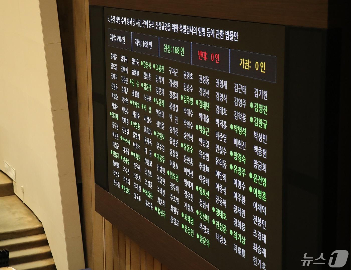 서울 여의도 국회에서 열린 제414회국회(임시회) 제1차 본회의에서 순직 해병 수사 방해 및 사건 은폐 등의 진상규명을 위한 특별검사의 임명 등에 관한 법률안이 국민의힘 의원들의 불참 속에 재적 296인, 재석 168인, 찬성 168인, 반대 0인, 기권 0인으로 가결된 가운데 본회의장 모니터에 김웅 국민의힘 의원이 찬성으로 표시되고 있다. 2024.5.2/뉴스1 ⓒ News1 임세영 기자