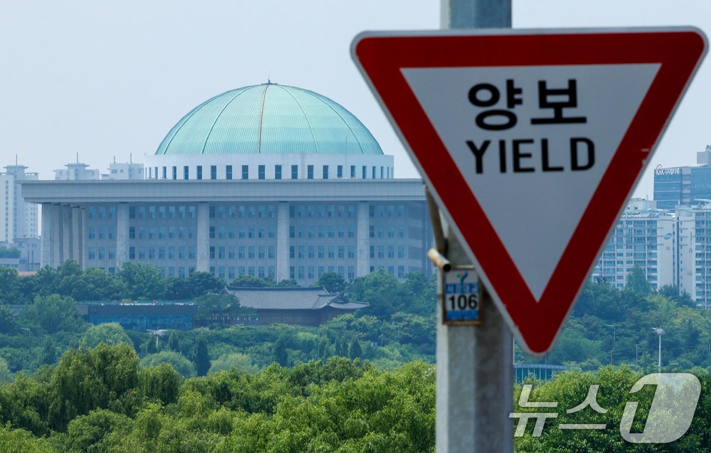 여야가 원구성 협상의 합의점을 찾지 못하고 있는 9일 서울 서강대교에 있는 양보 교통표지판 뒤로 국회의사당이 보이고 있다. 더불어민주당은 이날까지 합의에 이르지 못할 경우 10일 본회의를 열어 야당 단독으로 법제사법위원회·운영위원회·과학기술정보방송통신위원회를 포함한 11개 상임위원장을 선출하겠다고 예고했다. 2024.6.9/뉴스1 ⓒ News1 안은나 기자