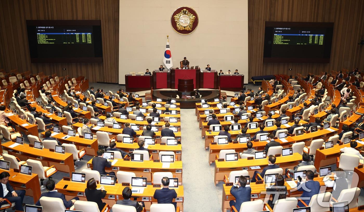 27일 오후 서울 여의도 국회에서 열린 제415회 국회(임시회) 제3차 본회의에서 7개 상임위원장 선거 결과가 발표되고 있다. 상임위원장은 윤한홍 정무위원장, 송언석 기획재정위원장, 김석기 외교통일위원장, 성일종 국방위원장, 이철규 산업통상자원중소벤처기업위원장, 신성범 정보위원장, 이인선 여성가족위원장이 선출됐다. 2024.6.27/뉴스1 ⓒ News1 김민지 기자