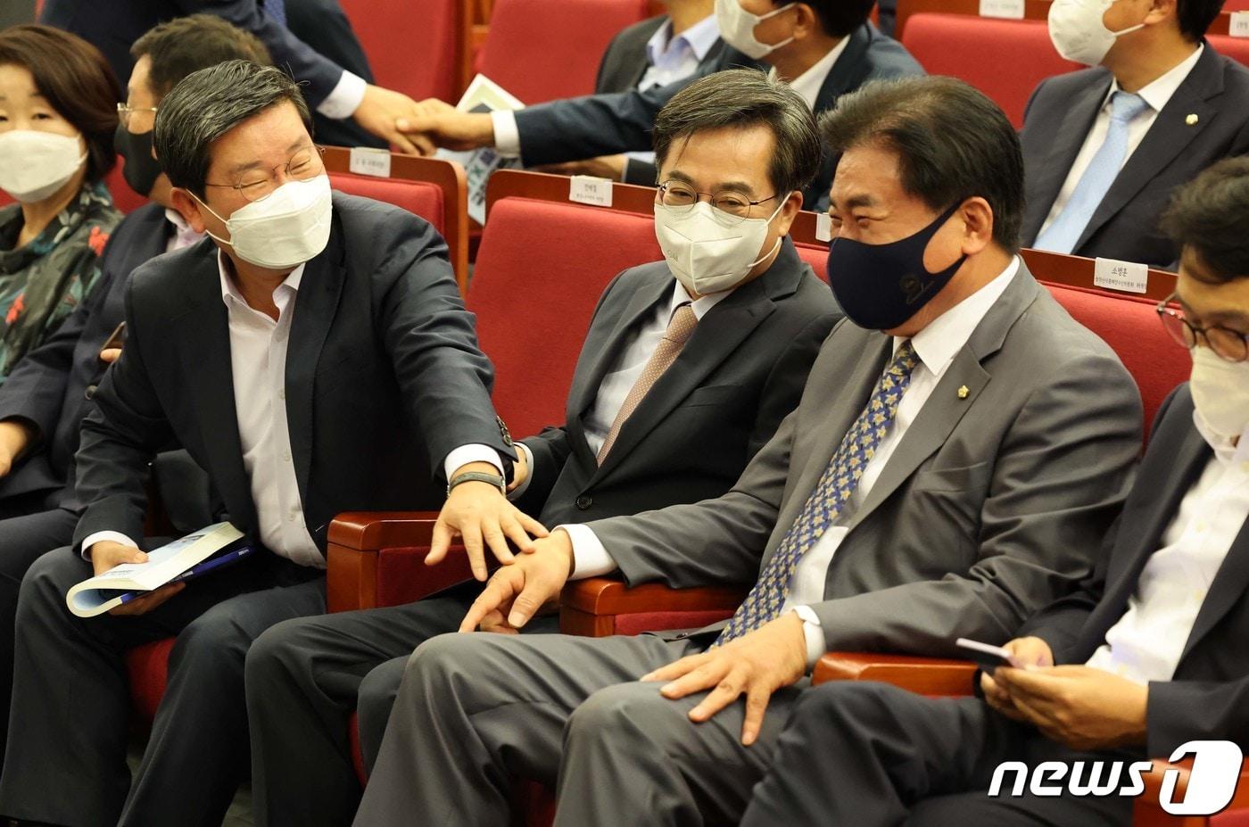 김동연 경기도지사(가운데)가 7일 오전 서울 여의도 국회 도서관에서 열린 ‘출·퇴근 하루 1시간의 여유를 위한 GTX플러스 국회토론회’에서 전해철(왼쪽), 소병훈 더불어민주당 의원과 대화를 하고 있다. 2022.9.7/뉴스1 ⓒ News1 이재명 기자관련 키워드전해철해마루노무현문재인더불어민주당임윤지 기자 민주, 1인1표+예비경선 당원 비율 확대…정청래 연임 포석?尹 '체포방해' 1심 징역 5년…범여권 "턱없이 부족, 유감"
