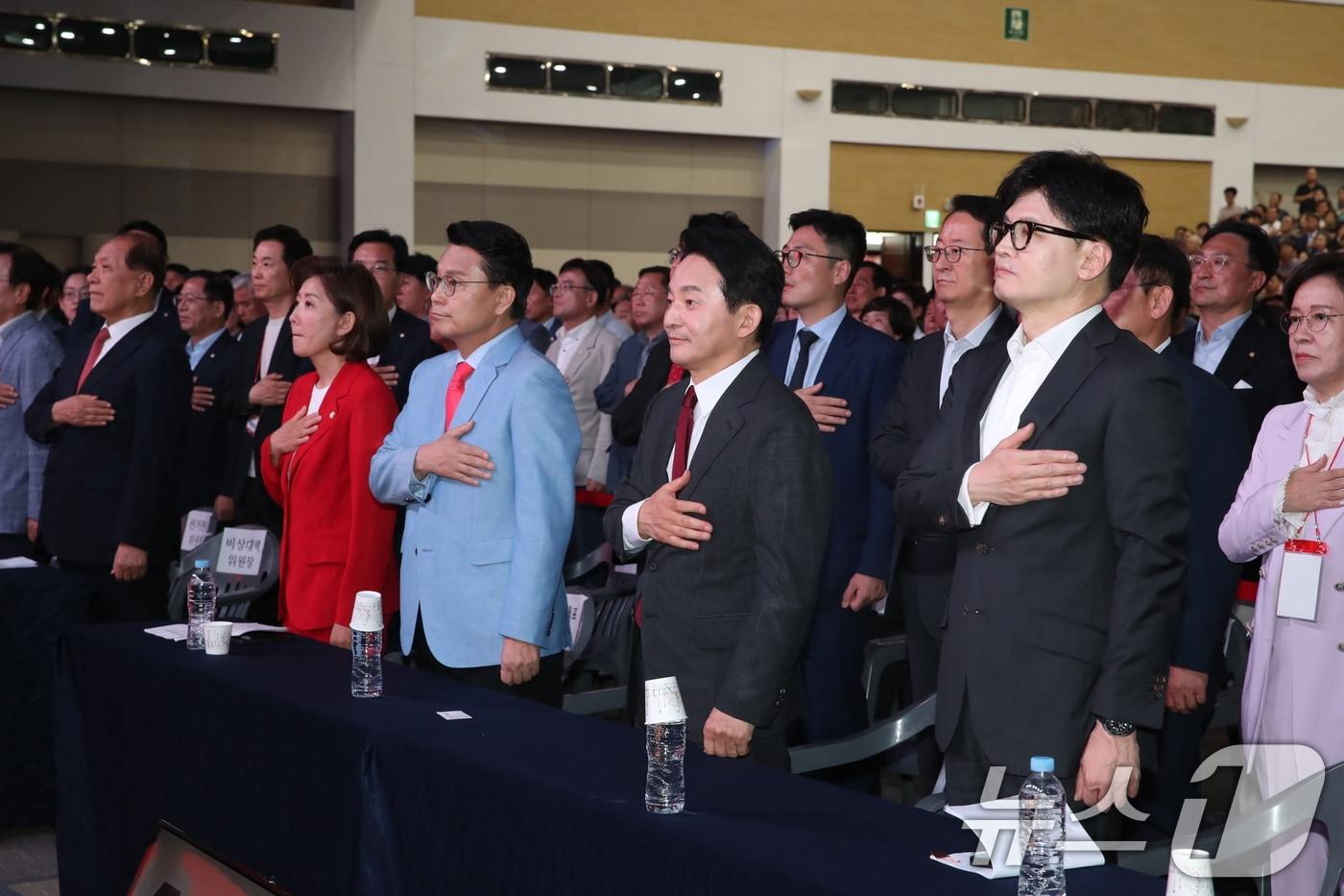 나경원(왼쪽부터), 윤상현, 원희룡, 한동훈 국민의힘 당대표 후보들이 12일 오후 대구 엑스코에서 열린 제4차 전당대회 대구·경북 합동연설회에서 국민의례를 하고 있다. 2024.7.12/뉴스1 ⓒ News1 이광호 기자
