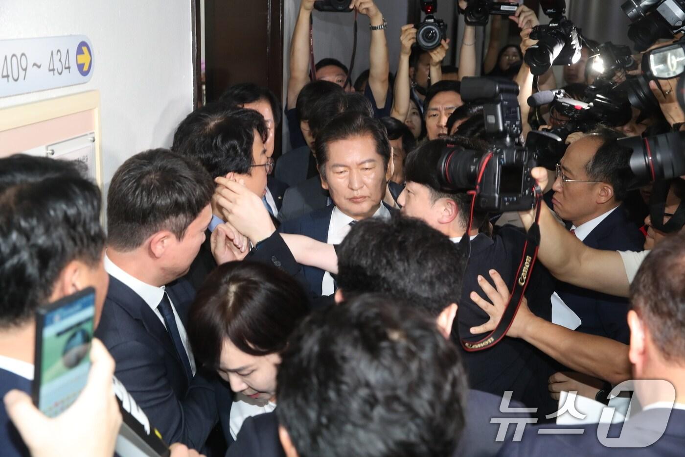 정청래 국회 법사위원회 위원장이 19일 오전 서울 여의도 국회 법제사법위원회에서 국민의힘 의원들의 항의를 받으며 '윤석열 대통령 탄핵소추안 즉각 발의 요청에 관한 청원 관련 1차 청문회' 회의장으로 향하고 있다. 2024.7.19/뉴스1 ⓒ News1 안은나 기자