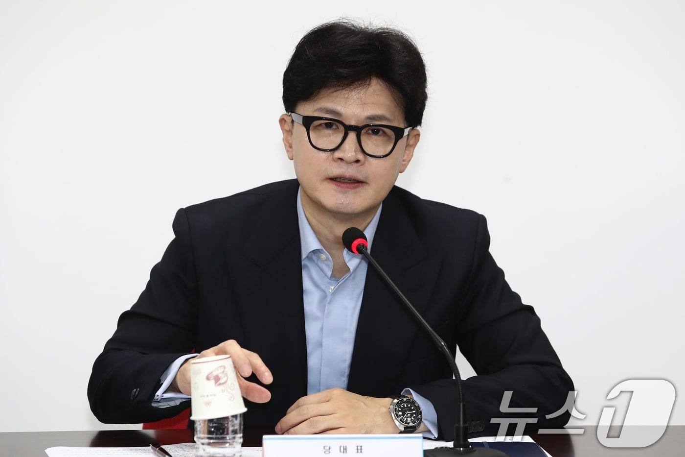 한동훈 국민의힘 대표가 22일 오전 서울 여의도 중앙당사에서 열린 최고위원회의에서 모두발언을 통해 "이재명 대표 측에서 이번 일요일로 약속했던 여야 대표회담을 (이 대표의) 코로나 증상으로 부득이 연기할 수밖에 없다는 말씀을 전해오셨다"며 "이 대표님의 쾌유를 바란다"고 말하고 있다. 2024.8.22/뉴스1 ⓒ News1 이광호 기자