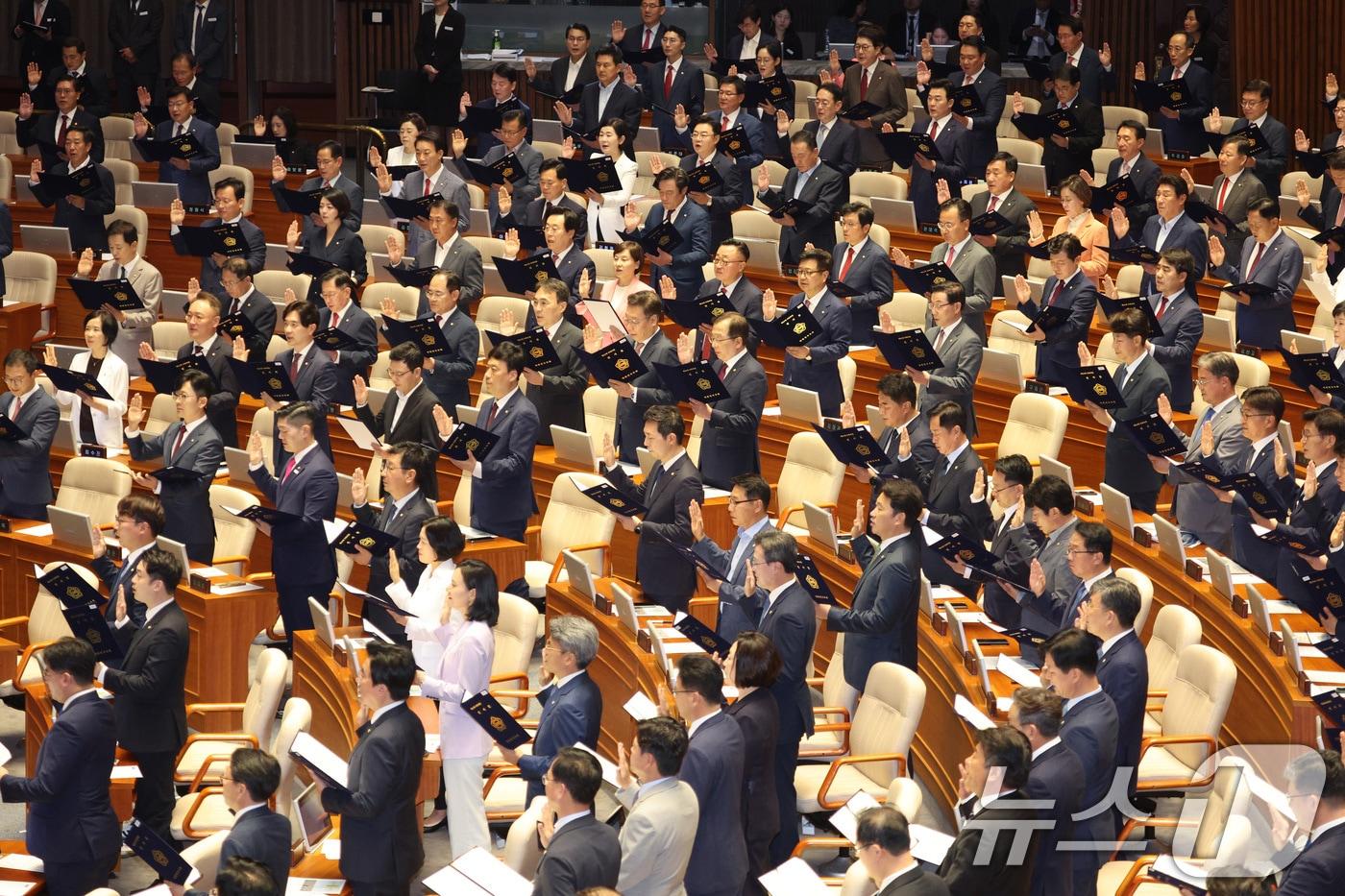 우원식 국회의장과 제22대 국회의원들이 2일 오후 서울 여의도 국회 본청 앞 계단에서 전반기 단체 기념 사진 촬영을 하고 있다. 2024.9.2/뉴스1 ⓒ News1 신웅수 기자박기현 기자 국힘 중진들, '한동훈 제명'에 "과하고 분열적" 우려…신중 결정 촉구野 "노동신문 개방 철회하라…北 실상이 아니라 체제선전물"