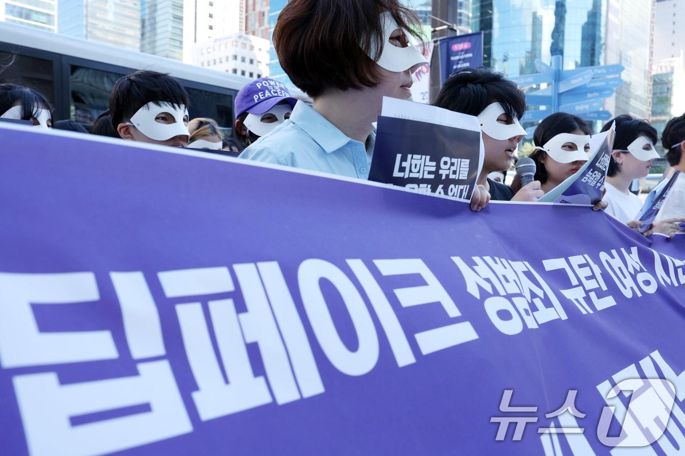 서울여성회 활동가와 서울여성회 페미니스트 대학생 연합동아리 학생 등이 29일 오후 서울 강남역 10번 출구 앞에서 딥페이크 성범죄 규탄 여성 시민·대학생 긴급 기자회견을 하고 있다. 이들은 딥페이크 성범죄는 놀이가 아니라 성폭력 범죄로 여성의 삶을 무너뜨리려 하고 있다며, 정부를 향해 철저한 진실규명과 가해자 처벌, 근본적인 재발방지 대책에 나서야 한다고 촉구했다. 2024.8.29/뉴스1 ⓒ News1 박정호 기자