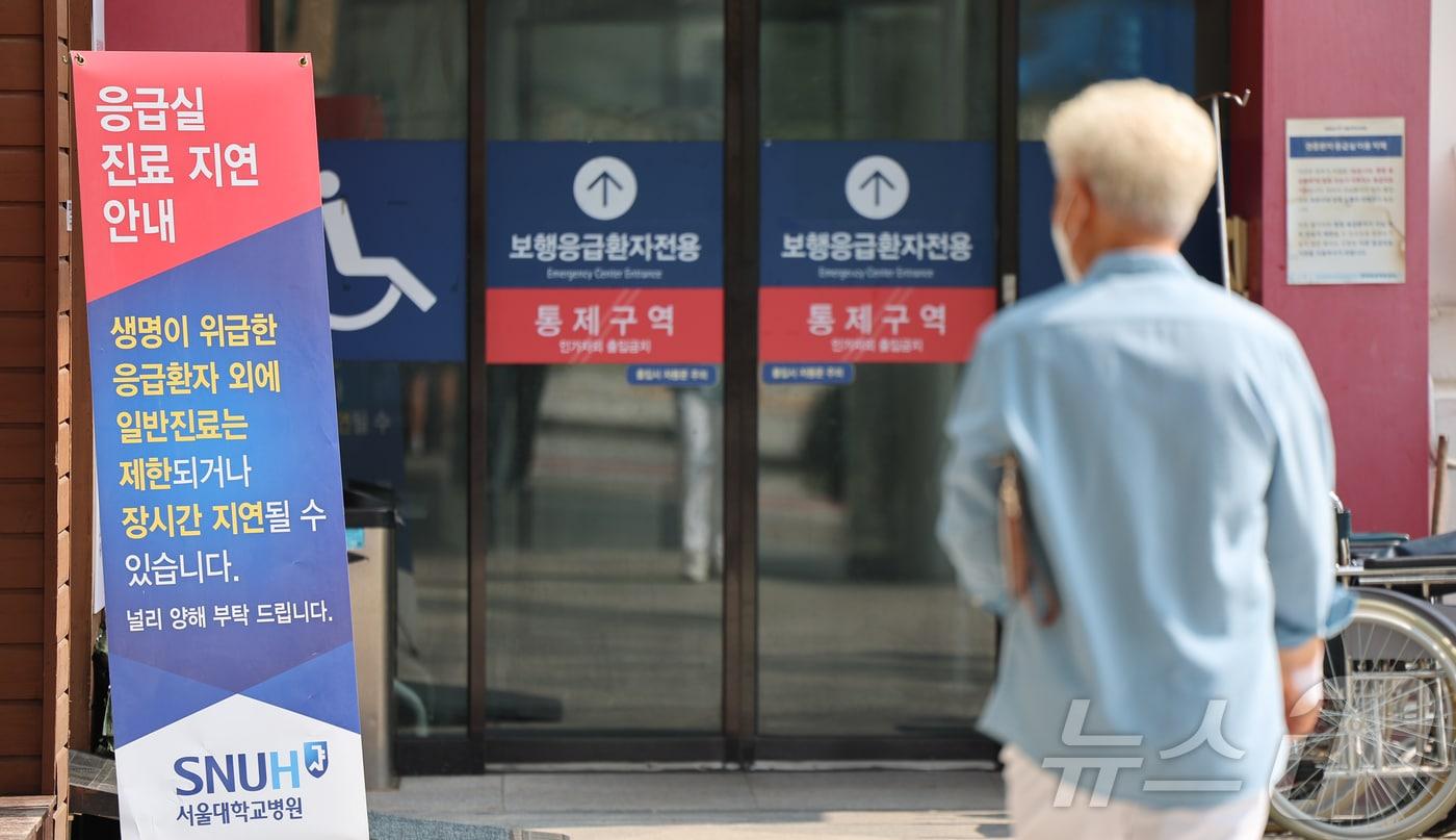 전공의 이탈로 불거진 전국 병원의 응급실 위기 상황이 추석 연휴를 1주일 앞두고 더욱 악화하고 있어 우려를 낳고 있다. 사진은 이날 서울 시내 한 대학병원 응급실 앞에 게시된 진료 지연 안내문. 2024.9.8/뉴스1 ⓒ News1 김도우 기자