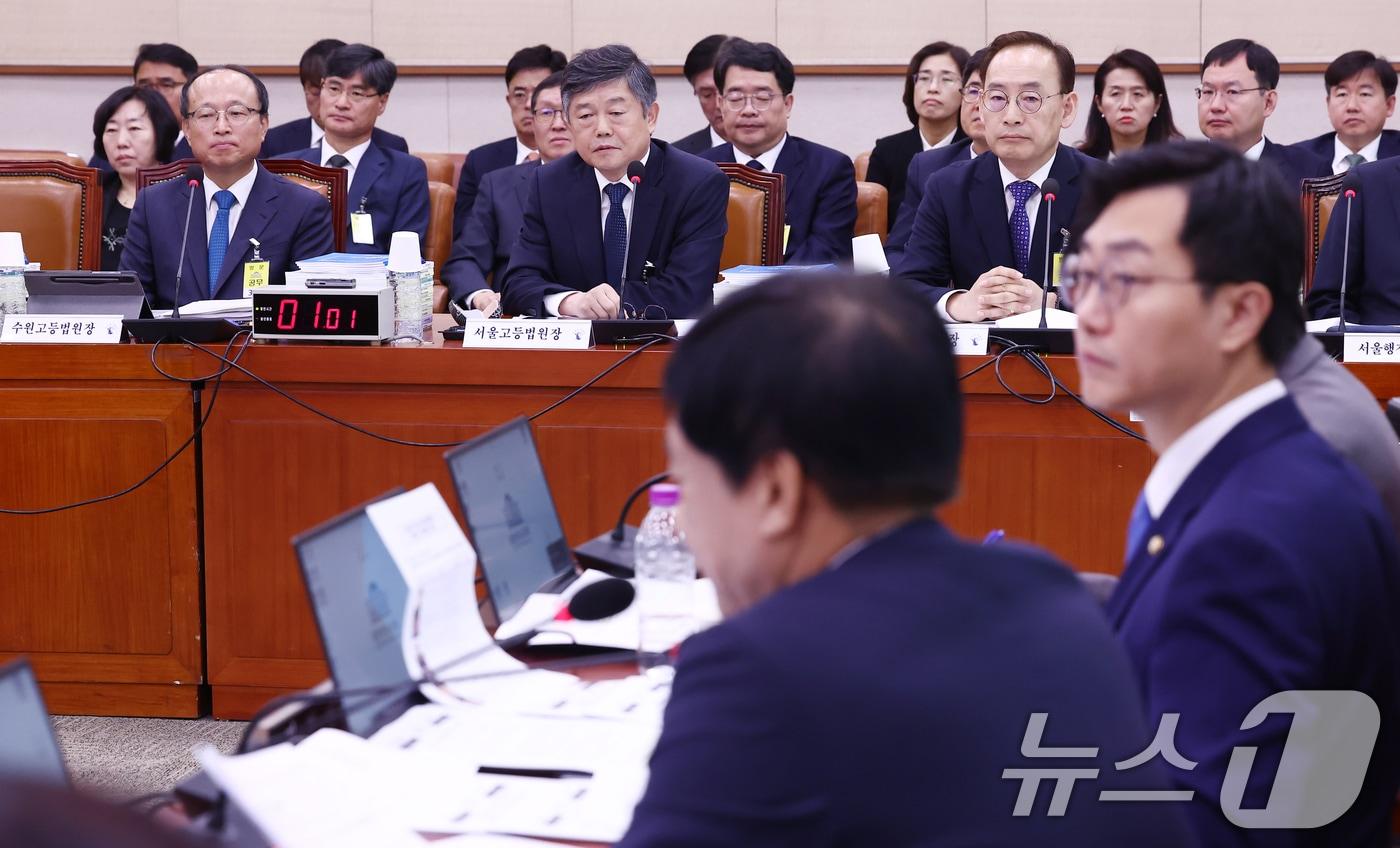 윤준 서울고등법원장이 22일 오전 서울 여의도 국회 법제사법위원회에서 열린 서울고등법원, 서울중앙지방법원 등에 대한 국정감사에서 의원 질의에 답변하고 있다. 왼쪽부터 이상주 수원고법원장, 윤 서울고법원장, 김정중 서울중앙지법원장. 2024.10.22/뉴스1 ⓒ News1 김민지 기자