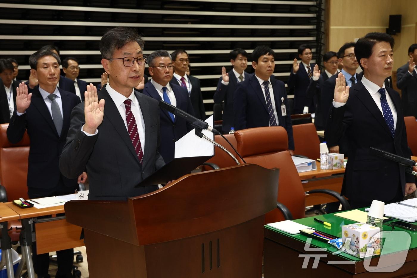 최재해 감사원장이 24일 오후 서울 종로구 감사원에서 열린 법제사법위원회의 감사원 대상 국정감사에서 증인 선서를 하고 있다. 2024.10.24/뉴스1 ⓒ News1 김민지 기자관련 키워드국정감사관련 기사송옥주 의원, 농협 규제 개선법 대표 발의'이화영 회유 의혹' 박상용 검사 "이미 술파티 있었다 결론 정해 수사"뉴스1 박정호·김도우·신웅수 기자, 이달의 보도사진상 수상경찰 '국감 위증 혐의' 류희림 전 방심위원장 불구속 송치김윤덕, 인국공에 경고 "세계 최고 전문가보다 국민 눈높이 우선"