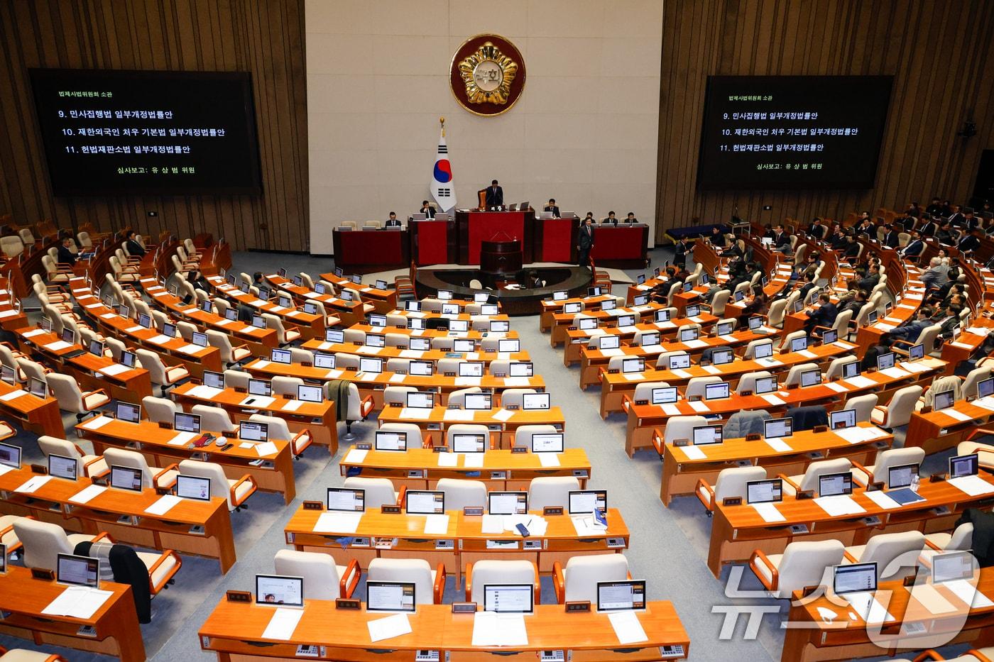 8일 오후 서울 여의도 국회에서 열린 제420회국회(임시회) 제4차 본회의에서 쌍특검법(내란·김건희 여사 특검법), 농업4법(양곡관리법·농수산물가격안정법·농어업재해대책법·농어업재해보험법 개정안) 등 8개 법안 재의의 건 부결에 더불어민주당 의원들이 규탄대회를 하기 위해 퇴장, 자리가 비어 있다. 2025.1.8/뉴스1 ⓒ News1 안은나 기자