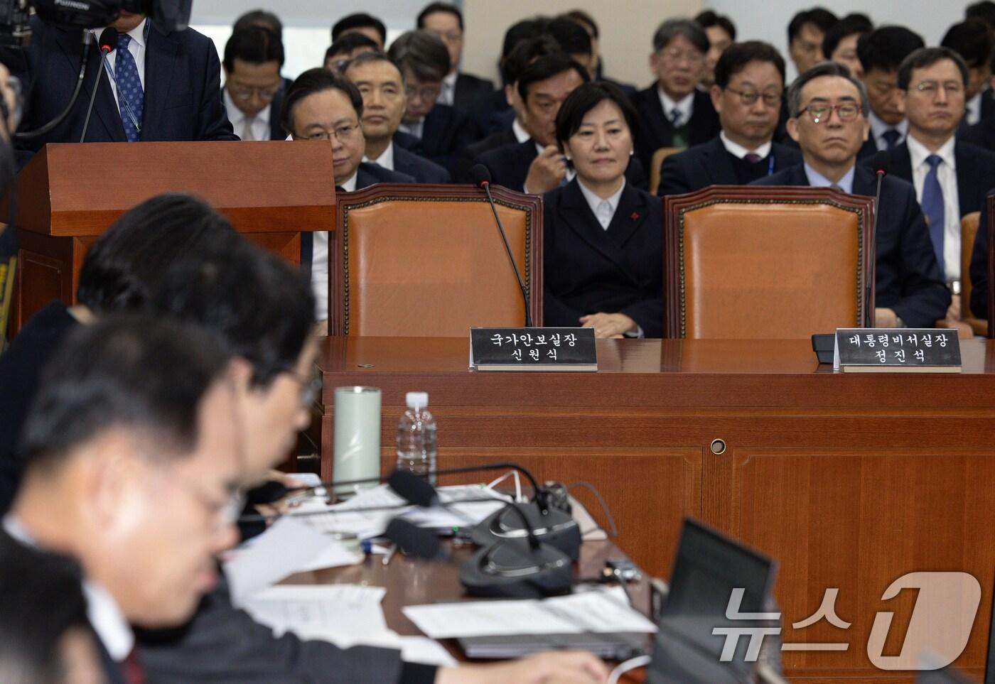 15일 오전 서울 여의도 국회에서 열린 윤석열 정부의 비상계엄 선포를 통한 내란 혐의 진상규명 국정조사특별위원회에 불참한 신원식 국가안보실장과 정진석 대통령비서실장의 자리가 비어 있다. 이날 국조특위 전체회의에서는 대통령실, 기획재정부, 법무부, 대검찰청, 공수처 등 기관보고와 현안 질의가 이어졌다. 2025.1.15/뉴스1 ⓒ News1 이재명 기자