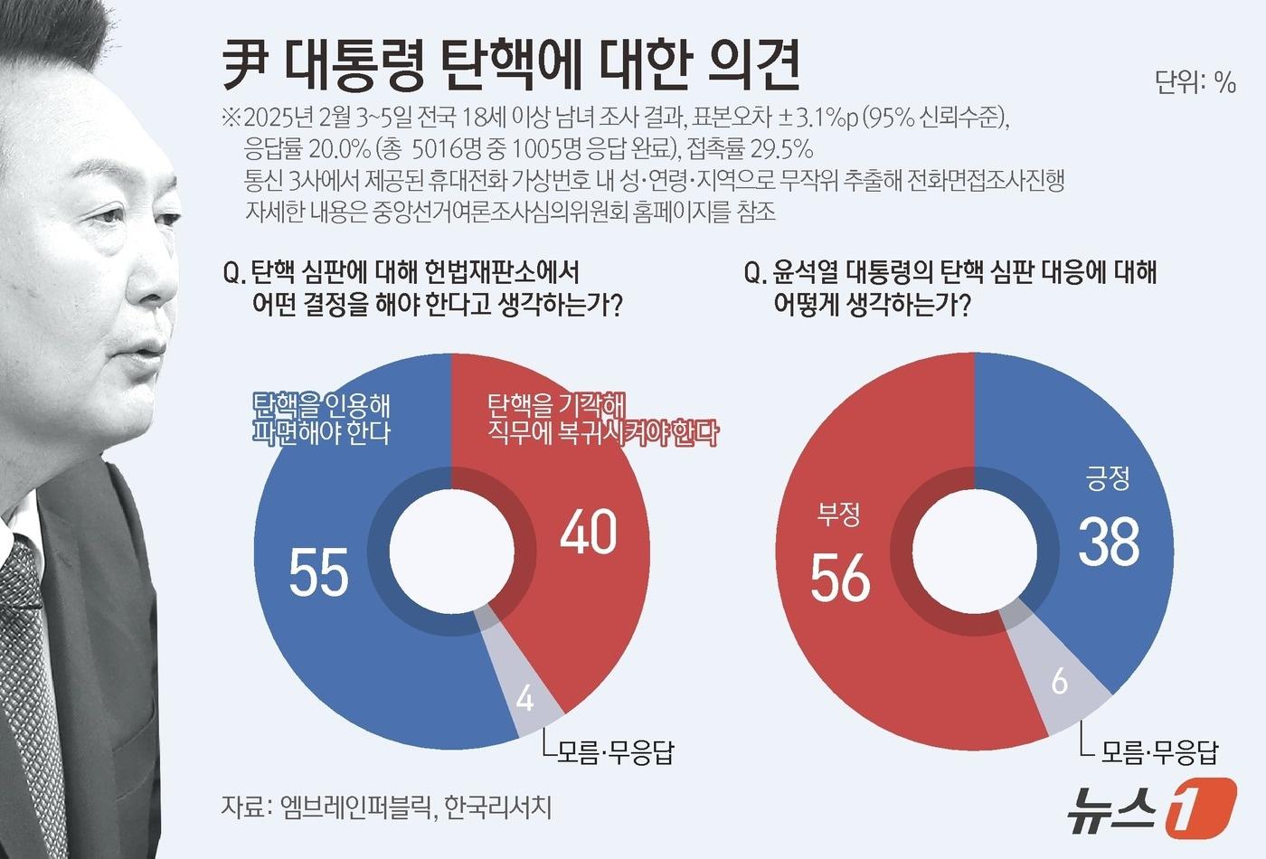 엠브레인퍼블릭·케이스탯리서치·코리아리서치·한국리서치가 지난 3일부터 5일까지 삼일간 전국 만 18세 이상 남녀 1005명을 대상으로 한 전국지표조사(NBS)에 따르면, 윤 대통령 탄핵심판에 대한 의견을 살펴보면 '탄핵을 인용해 파면해야 한다'는 55%, ‘탄핵을 기각해 직무에 복귀시켜야 한다’ 40%가 응답했다. 탄핵 심판 과정에 대한 윤석열 대통령의 대응에 대해 부정 평가는 56%, 긍정 평가는 38%로 나타났다. ⓒ News1 양혜림 디자이너