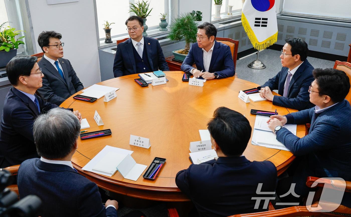 4일 서울 여의도 국회에서 열린 여야정(국회·정부) 국정협의회 2차 실무협의에서 참석자들이 대화를 나누고 있다. 왼쪽부터 시계방향으로 더불어민주당 이해식 당대표 비서실장, 진성준 정책위의장, 방기선 국무조정실장, 조오섭 국회의장 비서실장, 국민의힘 김상훈 정책위의장, 강명구 비상대책위원장 비서실장, 김범석 기획재정부 1차관, 곽현 국회의장 정무수석. 2025.2.4/뉴스1 ⓒ News1 안은나 기자