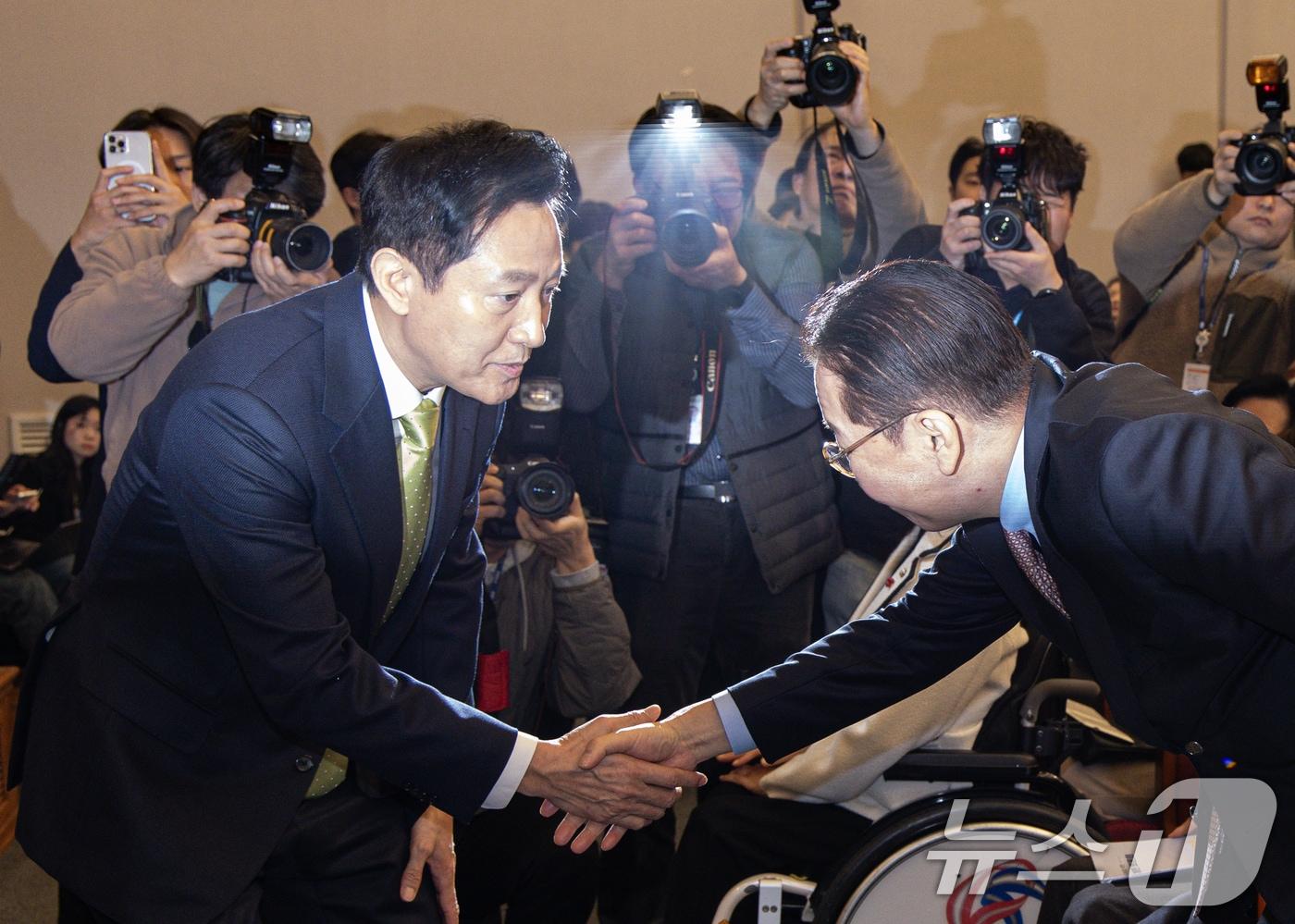 '지방분권 개헌 토론회' 참석…"대선 준비와 관련 없어""명태균 입에서 나오는 말 정치권 흔들면 검찰 책임"오세훈 서울시장(왼쪽)과 권영세 국민의힘 비상대책위원장이 12일 오전 서울 여의도 국회 도서관 대강당에서 서울특별시 ·서울연구원 주최로 열린 87체제 극복을 위한 지방분권 개헌 토론회에서 만나 악수하고 있다. 2025.2.12/뉴스1 ⓒ News1 이재명 기자관련 키워드오세훈대선명태균이설 기자 [동정] 오세훈, 고위공직자 대상 청렴 교육 수강전국 집중호우로 대피 3555명 '미귀가'…도로·철도 곳곳 통제한지명 기자 학폭 가해자, 명문대 못 간다…서울 주요 대학서 99% 탈락 시켜오세훈, 종합특검법 통과에 "특검중독 중증…종합 국기문란"관련 기사[일지] 김건희특검 출범부터 수사 종료까지 180일 여정'수사종료' 김건희특검, 尹부부 등 76명 기소…"金, 현대판 매관매직"지선준비 바쁜 여야, 공천룰에 발목…출마자 윤곽은 뚜렷국힘, 서울시장 수성·경기지사 유승민 등판론 속 하마평만 무성[인터뷰 전문] 신지호 "與 내년 당대표 경선, 김민석 대 정청래 구도 될 것"