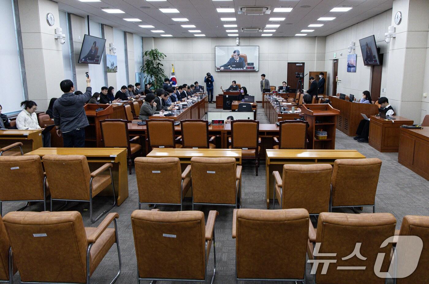 13일 오전 서울 여의도 국회에서 열린 제422회 국회(임시회) 윤석열 정부의 비상계엄 선포를 통한 내란 혐의 진상규명 국정조사특별위원회 제8차 전체회의에서 증인·참고인 출석 요구의 건이 가결되고 있다. 이날 국민의힘은 해당 안건에 대해 표결을 불참한다며 퇴장했다. 2025.2.13/뉴스1 ⓒ News1 이재명 기자