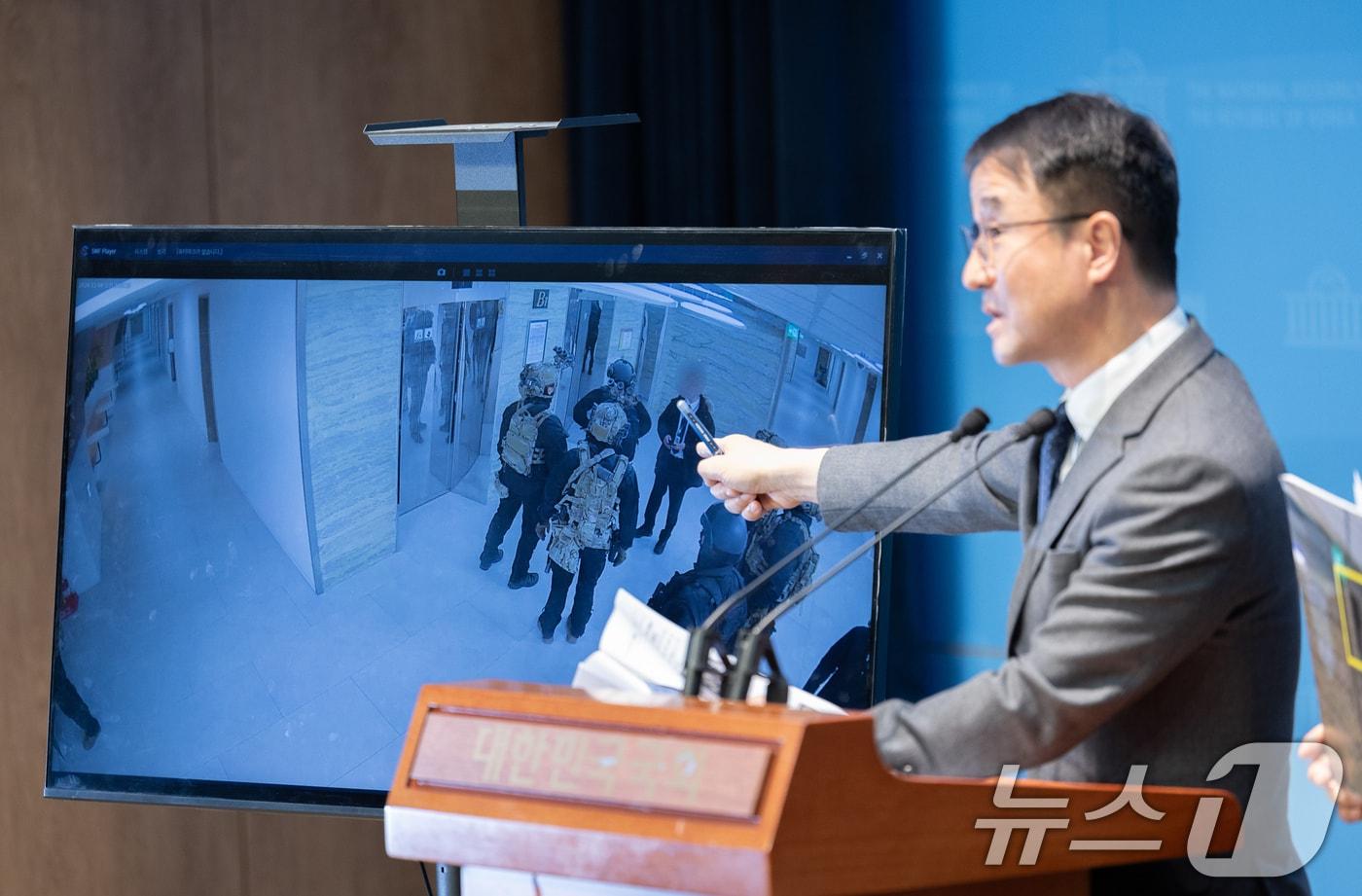 한병도 윤석열 정부의 비상계엄 선포를 통한 내란 혐의 진상규명 국정조사특별위원회 더불어민주당 간사를 비롯한 위원들이 16일 오전 서울 여의도 국회 소통관에서 긴급 기자회견을 열고 비상계엄 선포 당시 국회 본관 일부 전력을 차단했다는 사실을 확인했다고 발표하고 있다. 2025.2.16/뉴스1 ⓒ News1 이재명 기자