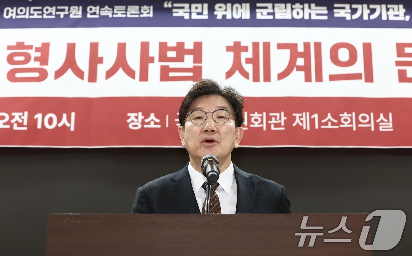 권성동 국민의힘 원내대표가 18일 오전 서울 여의도 국회 의원회관에서 열린 '창립 30주년 여의도연구원 연속토론회, 국민 위에 군림하는 국가기관 정상인가?'에서 축사를 하고 있다. 2025.2.18/뉴스1 ⓒ News1 김민지 기자