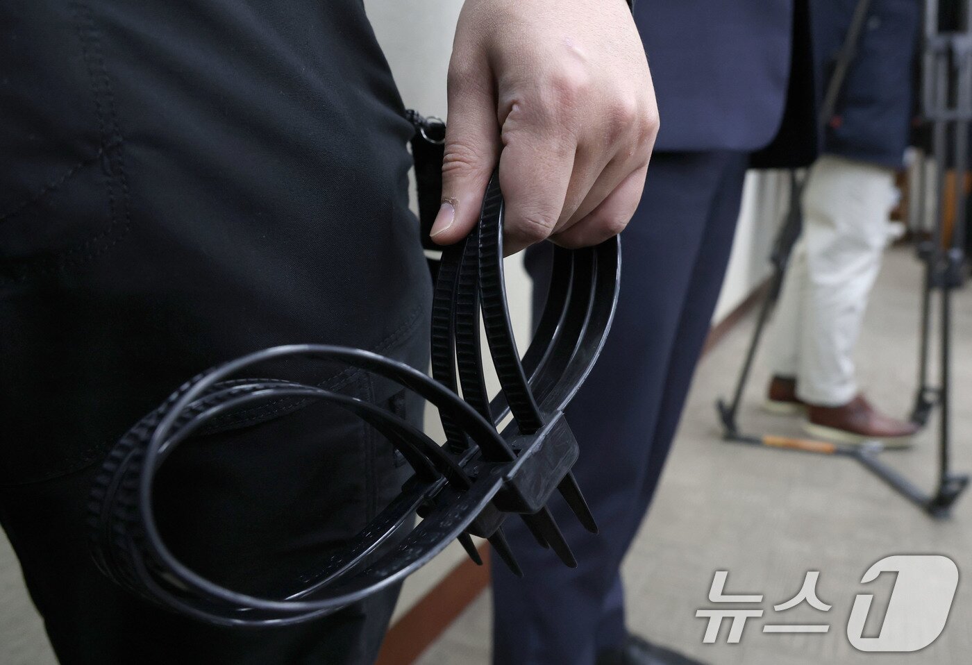 20일 오전 서울 여의도 국회에서 열린 국방위원회 전체회의에서 박선원 더불어민주당 의원실 비서관이 박 의원 질의를 위해 준비한 케이블타이 수갑을 들고 있다. 2025.2.20/뉴스1 ⓒ News1 이광호 기자
