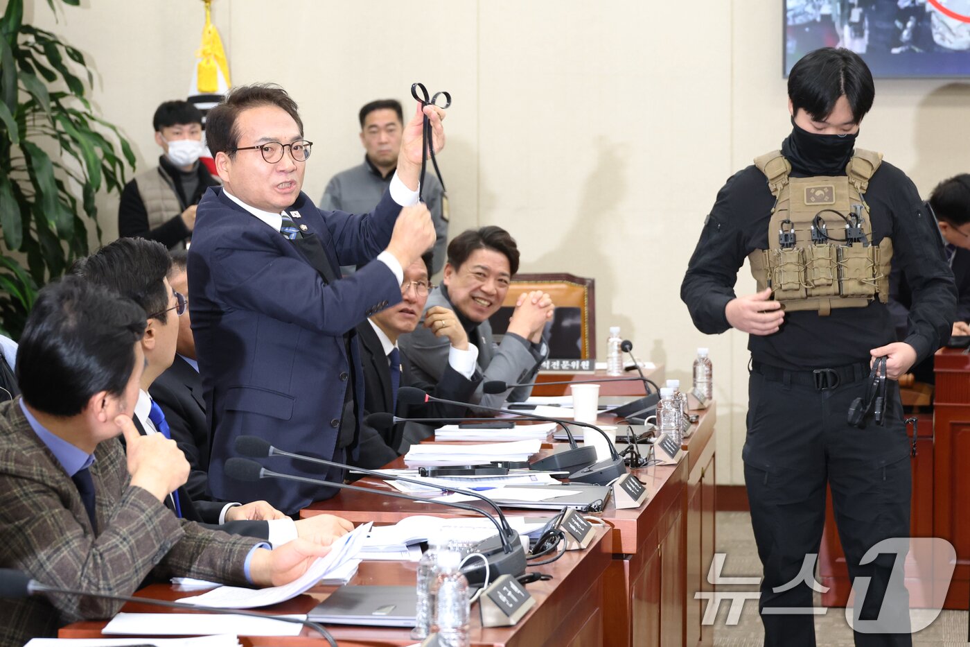 성일종 국회 국방위원장이 20일 오전 서울 여의도 국회에서 열린 국방위원회 전체회의에서 군용·군수업체의 경영상 부담을 완화하는 법안을 심의하던 도중 박선원 더불어민주당 의원이 비상계엄 당시 707특임부대가 휴대한 케이블타이를 꺼내들고 김선호 국방부장관 직무대행에게 질의하자 "법안과 전혀 상관없는 주제로 정쟁을 한다"며 회의를 정회, 박 의원과 설전을 벌이고 있다. 2025.2.20/뉴스1 ⓒ News1 이광호 기자