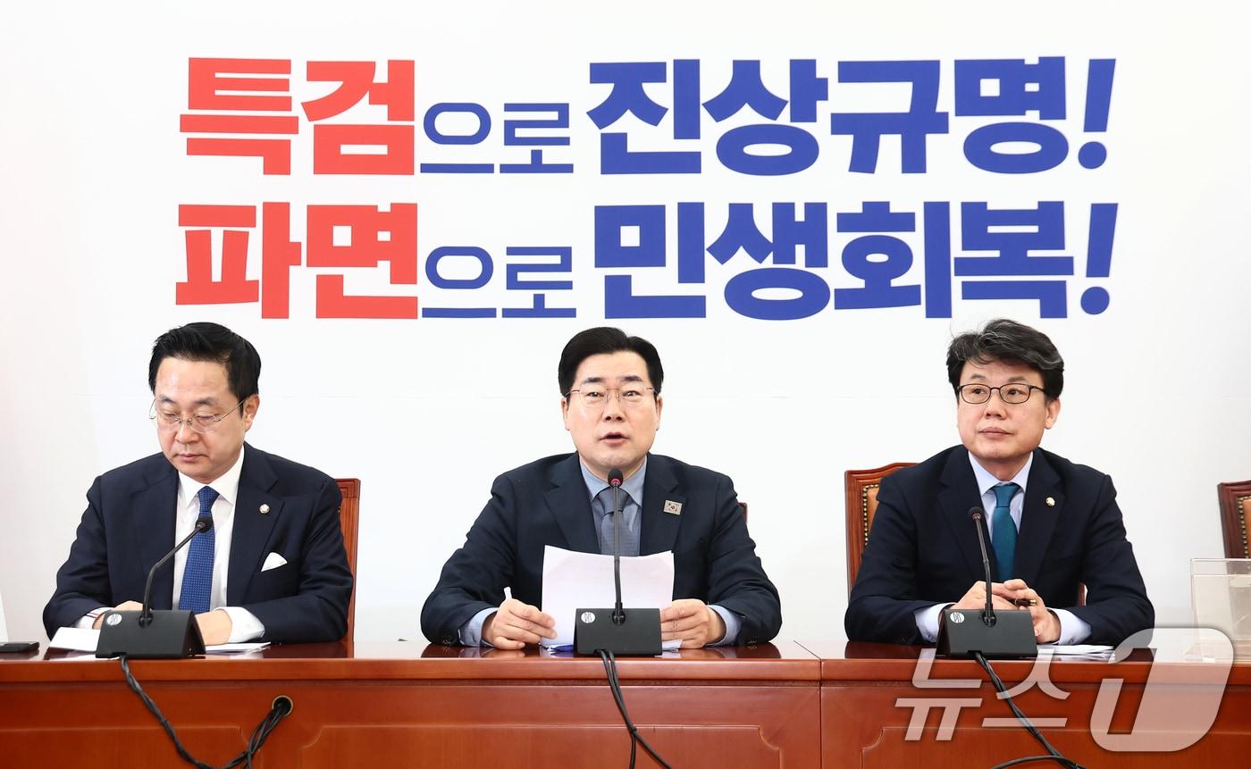 "12·3 이전으로 돌리면 윤석열 범죄사실 덮으려는 비상계엄 명확""명태균특검 나라 정상화 길, 국민이 국힘 지켜봐"…오늘 처리 방침박찬대 더불어민주당 원내대표가 27일 오전 서울 여의도 국회에서 열린 정책조정회의에서 모두 발언을 하고 있다. 오른쪽부터 진성준 정책위의장, 박 원내대표, 박성준 원내수석부대표. 2025.2.27/뉴스1 ⓒ News1 김민지 기자관련 키워드박찬대더불어민주당명태균특검법윤석열김건희명태균김일창 기자 '내란+김건희+해병대원' 2차 특검법 통과…野 "지선용 내란몰이"(종합)'내란+김건희+해병대원' 2차 특검법 국회 통과…6개월 251명 투입관련 기사운명의 8월1일 관세발효 '째깍'…이번주(28~1) 주요일정[인터뷰 전문] 신지호 "국힘 지도부는 '좀비'...살고 싶으면 尹 청산"[인터뷰 전문]이지은 "특검 비대? 尹·김건희가 죄를 너무 많이 저지른 것"[뉴스1 PICK]'3대 특검법' 국회 본회의 與 주도 통과'7차례 폐기' 김건희·내란 특검법 재발의…민주 "국힘 표적 아니다"
