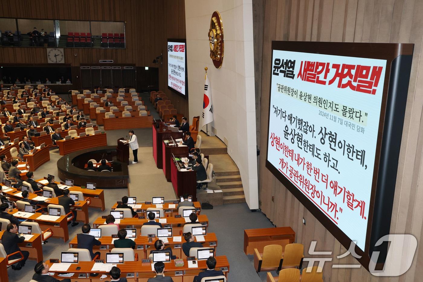 서영교 더불어민주당 의원이 27일 오후 서울 여의도 국회에서 열린 본회의에서 명태균 특검법 찬성 토론을 하고 있다. 2025.2.27/뉴스1 ⓒ News1 이광호 기자