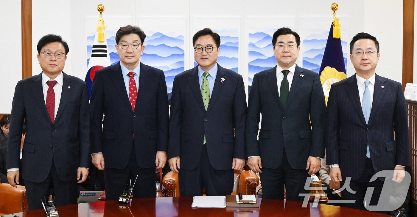 본문 이미지 - 권성동 국민의힘 원내대표와 우원식 국회의장, 박찬대 더불어민주당 원내대표가 4일 서울 여의도 국회에서 열린 국회의장 주재 여야 원내대표 회동에 참석해 기념촬영을 하고 있다. (공동취재) 2025.3.4/뉴스1 ⓒ News1 이광호 기자