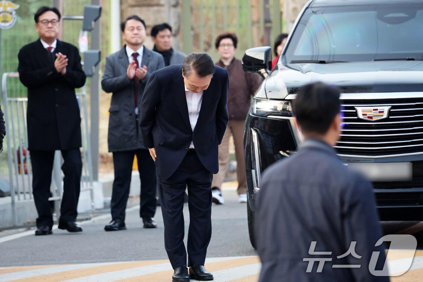 법원의 구속취소 청구 인용으로 석방된 윤석열 대통령이 8일 오후 경기 의왕시 서울구치소에서 풀려나 지지자들에게 인사하고 있다. 윤 대통령은 내란 우두머리 혐의로 지난 1월 26일 구속기소 된 지 41일 만, 1월 15일 체포된 후 52일 만에 자유의 몸이 됐다. 2025.3.8/뉴스1 ⓒ News1 오대일 기자