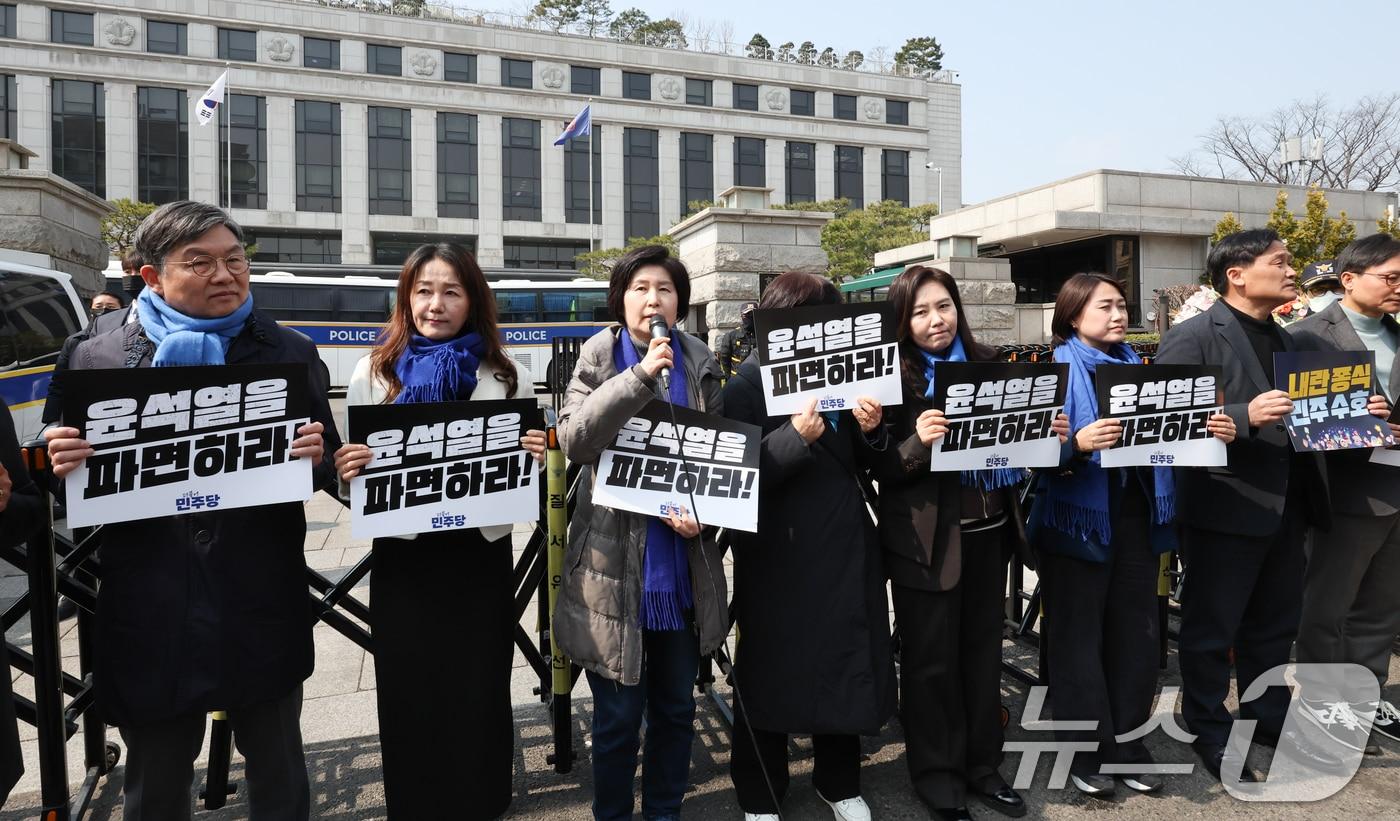 백혜련 더불어민주당 의원이 20일 서울 종로구 헌법재판소 앞에서 열린 극우 폭력 사태 규탄 기자회견에서 발언을 하고 있다. 백혜련 더불어민주당 의원과 이건태 의원은 이날 아침 윤석열 대통령의 신속한 파면을 촉구하는 기자회견을 벌이던 도중 건너편 인도에서 날아온 날계란과 바나나 등을 맞았다. 2025.3.20/뉴스1 ⓒ News1 허경 기자