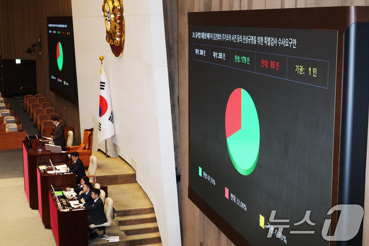 지난 19일 법사위 전체회의서 야당 주도 통과…여당 표결 불참'대통령 거부권 행사' 못하지만 '추천 지연'으로 비슷한 효과20일 오후 서울 여의도 국회에서 열린 본회의에서 윤석열 대통령 배우자 김건희의 주가조작 사건 등의 진상규명을 위한 특별검사 수사요구안이 재적 300인, 재석 265인, 찬성 179인, 반대 85인, 기권 1인으로 가결되고 있다. 2025.3.20/뉴스1 ⓒ News1 이광호 기자관련 키워드김건희 상설특검안마약 상설특검안국회 본회의임윤지 기자 與 김병기 징계 "신속 수습" 강조하지만…재심→의총 표결 '장기전'민주, 1인1표+예비경선 당원 비율 확대…정청래 연임 포석?손승환 기자 국힘, 尹 체포방해 징역 5년에 "입장 없다…사법부 판단 존중"송언석 "제1야당 대표 단식…공천뇌물 특검 반드시 이뤄져야"관련 기사권성동 "상설특검은 '이재명 오른팔 특검'…정부 임명 안 돼"친한 한지아, 김건희 상설특검안에 찬성표결[속보] 마약 상설특검안, 찬175 반76…野 주도 본회의 통과[속보] '김건희 상설특검안' 국회 본회의 통과…찬성 179·반대 85김건희 상설특검 본회의 통과 전망…연금개혁안 상정 가능성도