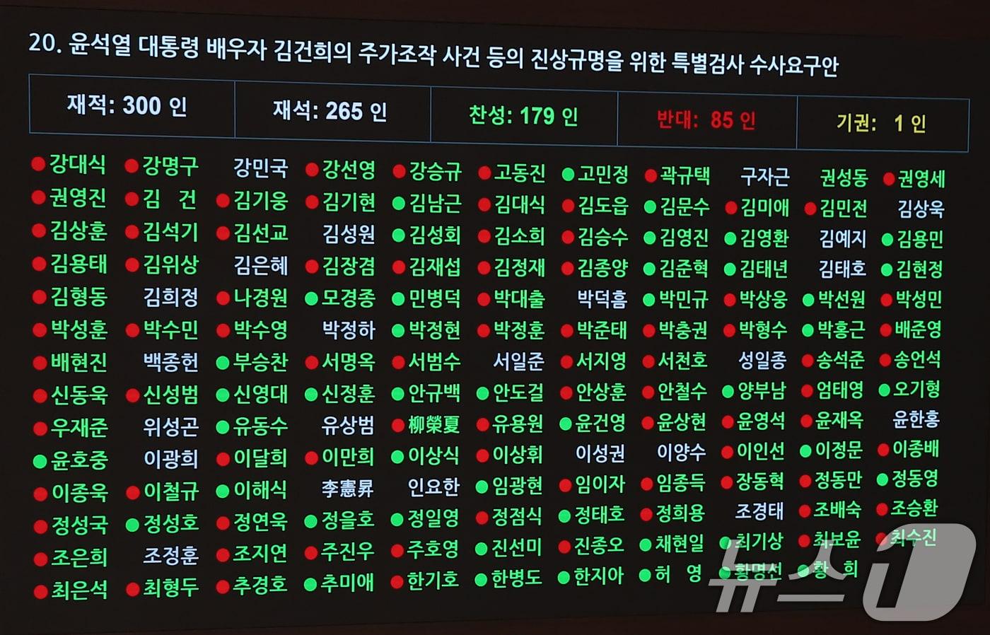 재석 265명 중 찬성 179명, 반대 85명으로 가결20일 오후 서울 여의도 국회에서 열린 제423회국회(임시회) 제2차 본회의에서 윤석열 대통령 배우자 김건희의 주가조작 사건 등의 진상규명을 위한 특별검사 수사요구안에 대한 표결이 진행되고 있다. 2025.3.20/뉴스1 ⓒ News1 김민지 기자관련 키워드한지아김건희 상설특검안손승환 기자 국힘, 尹 체포방해 징역 5년에 "입장 없다…사법부 판단 존중"송언석 "제1야당 대표 단식…공천뇌물 특검 반드시 이뤄져야"