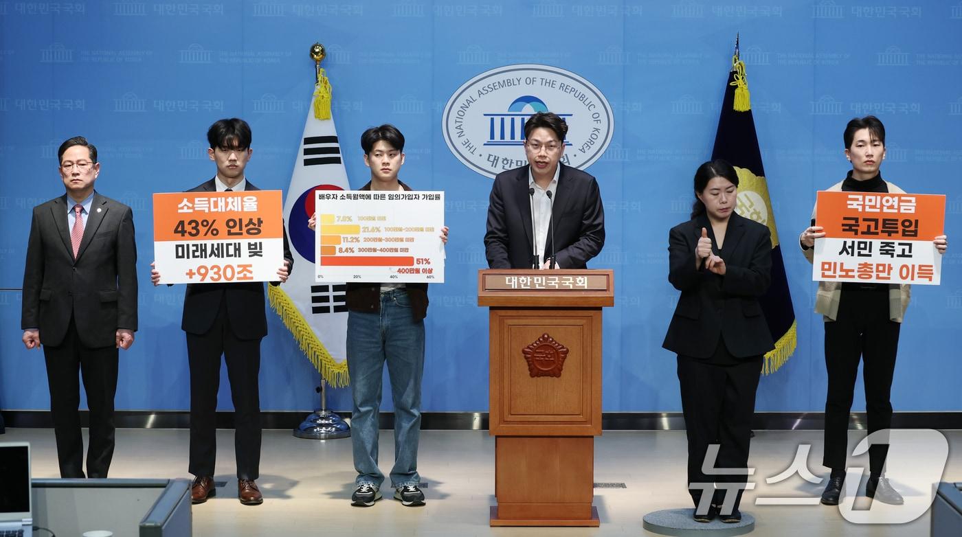 여당 중심으로 반발 목소리 터져나와…잠룡들도 일제히 비판탄핵 정국서 겨우 마음 돌린 청년층마저 이탈할까 위기감연금개혁청년행동 손영광 대표 등이 21일 오전 서울 여의도 국회 소통관에서 기자회견을 열고 소득대체율 인상과 국민연금 지급보장 명문화 등 여야가 합의한 연금개혁안을 규탄하고 있다. 2025.3.21/뉴스1 ⓒ News1 이광호 기자관련 키워드국민의힘연금개혁안구진욱 기자 추울 땐 실내로! 올겨울 꼭 가야 할 무료 전시 7곳[서울in]서울 지하철 3호선 오금역 선로 연기…조치 완료 후 운행 재개관련 기사[단독] 연금 지출 5년새 22조→42조 '두배'…"구조개혁 병행돼야"연금개혁특위 여야, '정부 국민연금 재정건전성' 한목소리 우려1249만 '청년 표심'…李 '맞춤 공공분양' 金 '신입공채 부활'이준석 TV토론 '두 자릿수 지지율' 노린다…"이재명은 매표"6·3 대선 연금 공약은?…李 "소득 보장↑"·金 "재정안정"