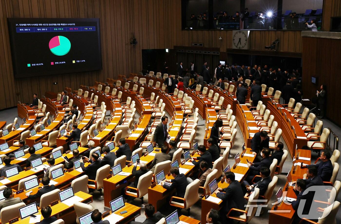 20일 오후 서울 여의도 국회에서 열린 제423회국회(임시회) 제2차 본회의에서 인천세관 마약 수사외압 의혹 사건 등 진상규명을 위한 특별검사 수사요구안이 통과되고 있는 가운데 국민의힘 의원들이 퇴장하고 있다. 2025.3.20/뉴스1 ⓒ News1 김민지 기자