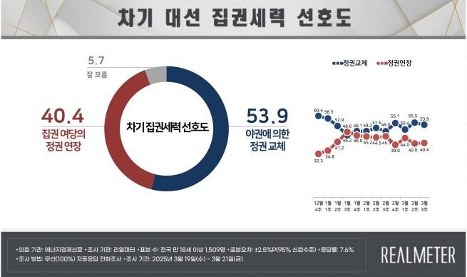 정권교체·정권연장 격차 소폭 줄어…교체 1.6%p 하락민주당 43.6%·국민의힘 40%…민주당 하락·국힘 상승(리얼미터 제공)관련 키워드여론돌려보기리얼미터정권교체정권연장여론조사김일창 기자 與 "장동혁 단식, 책임회피용 정치쇼…얄팍한 꼼수"(종합)與 '중수청·공소청법' 20일 토론회…"정부, 당 입장 존중"(종합)관련 기사민주 46.9% 국힘 35.1%…중도층선 46.8% 27.3% [리얼미터]정권교체 50.4% vs 연장 44.0%…국힘 42.7% 민주 41.0% [리얼미터]정권연장 45.3% vs 교체 49.0%…국힘 42.7% 민주 41.1% [리얼미터]