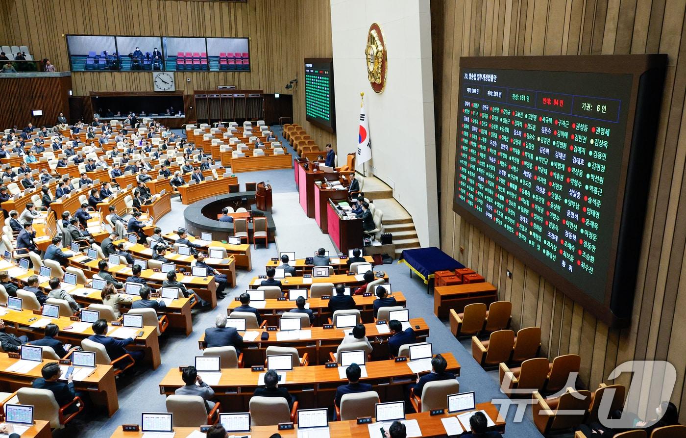 공영방송 이사 15명, 이사추천권 다양화 등26일 오후 서울 여의도 국회에서 열린 제420회국회(임시회) 제1차 본회의에서 방송법 일부개정법률안이 재적 300인 중 재석 261인, 찬성 161인, 반대 94인, 기권 6인으로 통과되고 있다. 2024.12.26/뉴스1 ⓒ News1 안은나 기자관련 키워드방송법이진숙윤석열임윤지 기자 與 김병기 징계 "신속 수습" 강조하지만…재심→의총 표결 '장기전'민주, 1인1표+예비경선 당원 비율 확대…정청래 연임 포석?관련 기사장동혁 단식 농성장 찾은 천하람…"통일교·공천헌금 특검 끝까지 함께"김종철 방미통위원장 후보 오늘 첫 출근…남은 절차는내년 문 닫는 검찰청 국감…'쿠팡·관봉권·연어술파티' 공방 예고TBS 민영화 놓고 서울시-尹 대통령실 공조?…"사실무근"위원 없는 방미통위 첫 국감…KT 소액결제 피해 추가 [뉴스잇(IT)쥬]
